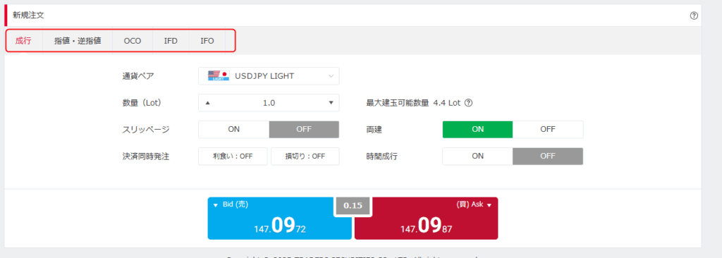 「注文方法」「注文種別」「オーダータイプ」など、業者によって表記はやや異なりますが、基本的な構造は同じです。