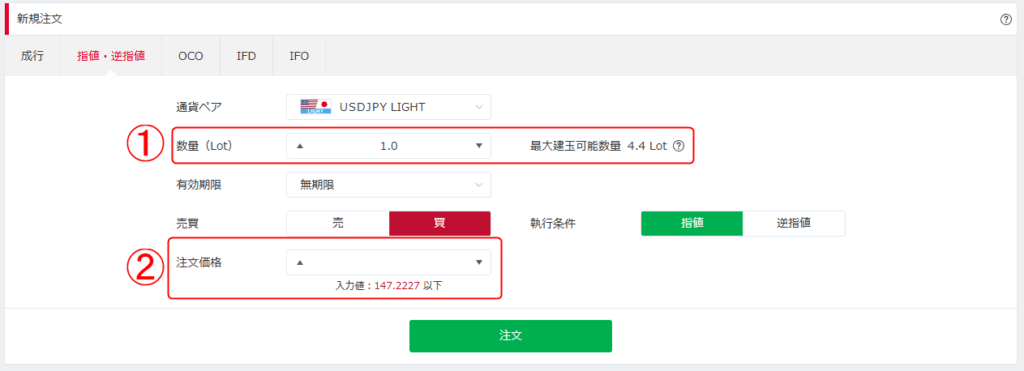 注文タイプを選んだら、次は「①:注文数量(ロット数)」と「②:価格の入力(成行以外)」の設定です。