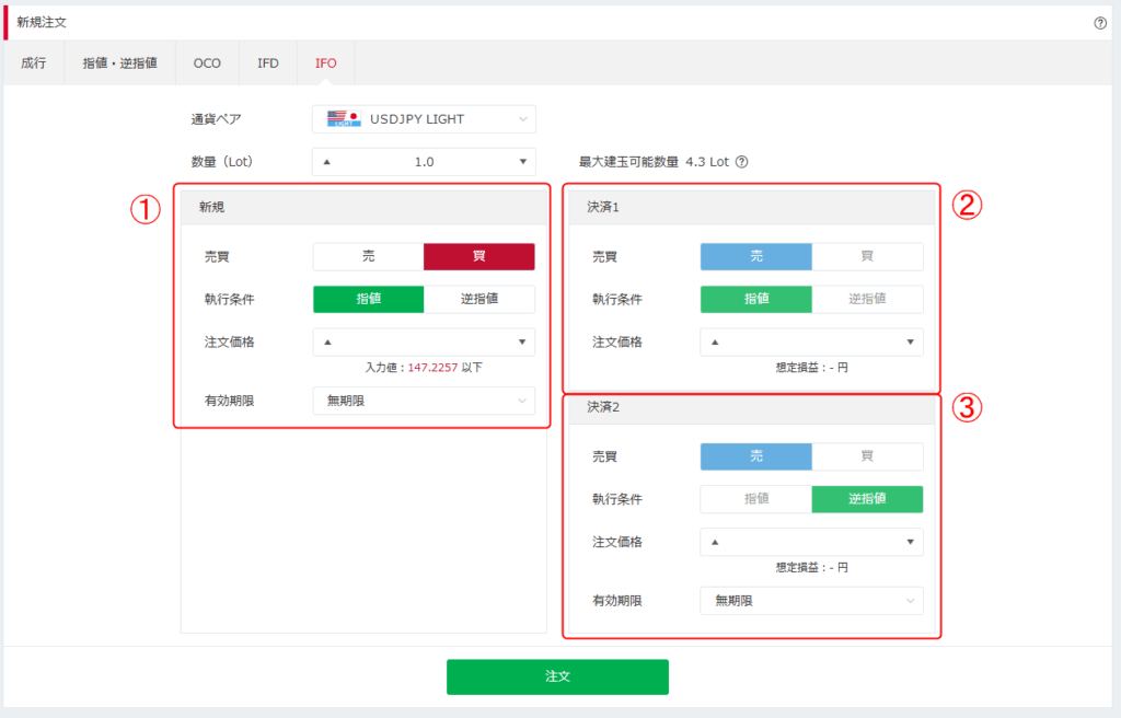 多くのFX口座では「①:新規注文」「②:損切り」「③:利確」これらを同時に設定できる便利な機能( IFO注文)がついています。